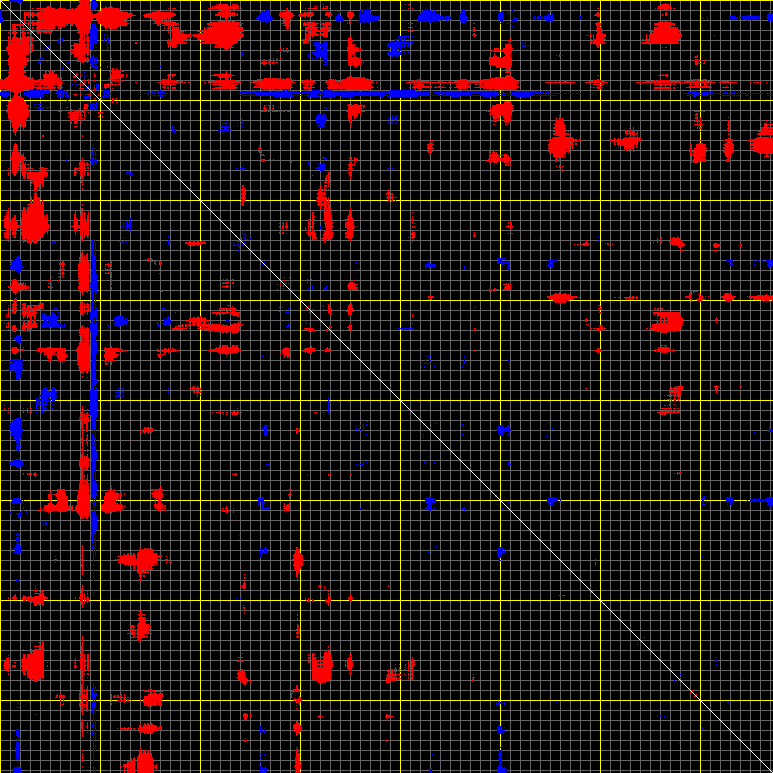 This matrix displays the maximum distance fluctuations between all pairs of CA atoms and between the two extreme conformations that were computed for this mode (DQMIN/DQMAX). Distance increases are plotted in blue and decreases in red for the strongest 10% of the residue pair distance changes. Every pixel corresponds to a single residue. Grey lines are drawn every 10 residues, yellow lines every 100 residues (counting from the upper left corner).