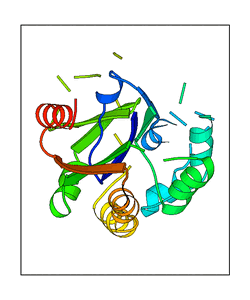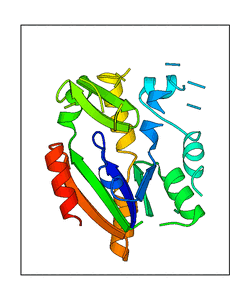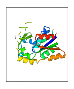 These views are prepared from three orthologuous viewpoints with MolScript. Secondary structures are determined from the C-alpha atom positions of your protein (N-terminal blue, C-terminal red).