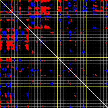 This matrix displays the maximum distance fluctuations between all pairs of CA atoms and between the two extreme conformations that were computed for this mode (DQMIN/DQMAX). Distance increases are plotted in blue and decreases in red for the strongest 10% of the residue pair distance changes. Every pixel corresponds to a single residue. Grey lines are drawn every 10 residues, yellow lines every 100 residues (counting from the upper left corner).