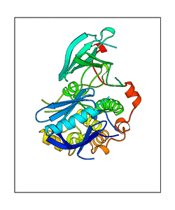 These views are prepared from three orthologuous viewpoints with MolScript. Secondary structures are determined from the C-alpha atom positions of your protein (N-terminal blue, C-terminal red).