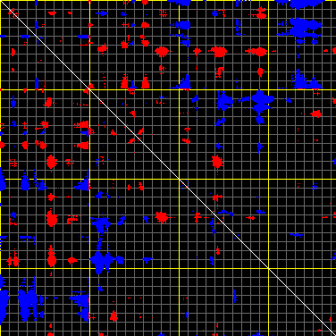 This matrix displays the maximum distance fluctuations between all pairs of CA atoms and between the two extreme conformations that were computed for this mode (DQMIN/DQMAX). Distance increases are plotted in blue and decreases in red for the strongest 10% of the residue pair distance changes. Every pixel corresponds to a single residue. Grey lines are drawn every 10 residues, yellow lines every 100 residues (counting from the upper left corner).