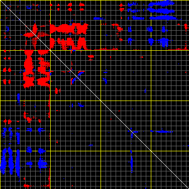 This matrix displays the maximum distance fluctuations between all pairs of CA atoms and between the two extreme conformations that were computed for this mode (DQMIN/DQMAX). Distance increases are plotted in blue and decreases in red for the strongest 10% of the residue pair distance changes. Every pixel corresponds to a single residue. Grey lines are drawn every 10 residues, yellow lines every 100 residues (counting from the upper left corner).