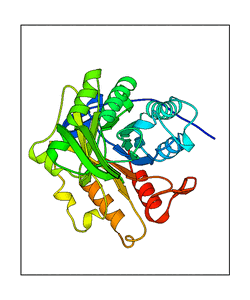 These views are prepared from three orthologuous viewpoints with MolScript. Secondary structures are determined from the C-alpha atom positions of your protein (N-terminal blue, C-terminal red).