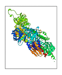 These views are prepared from three orthologuous viewpoints with MolScript. Secondary structures are determined from the C-alpha atom positions of your protein (N-terminal blue, C-terminal red).