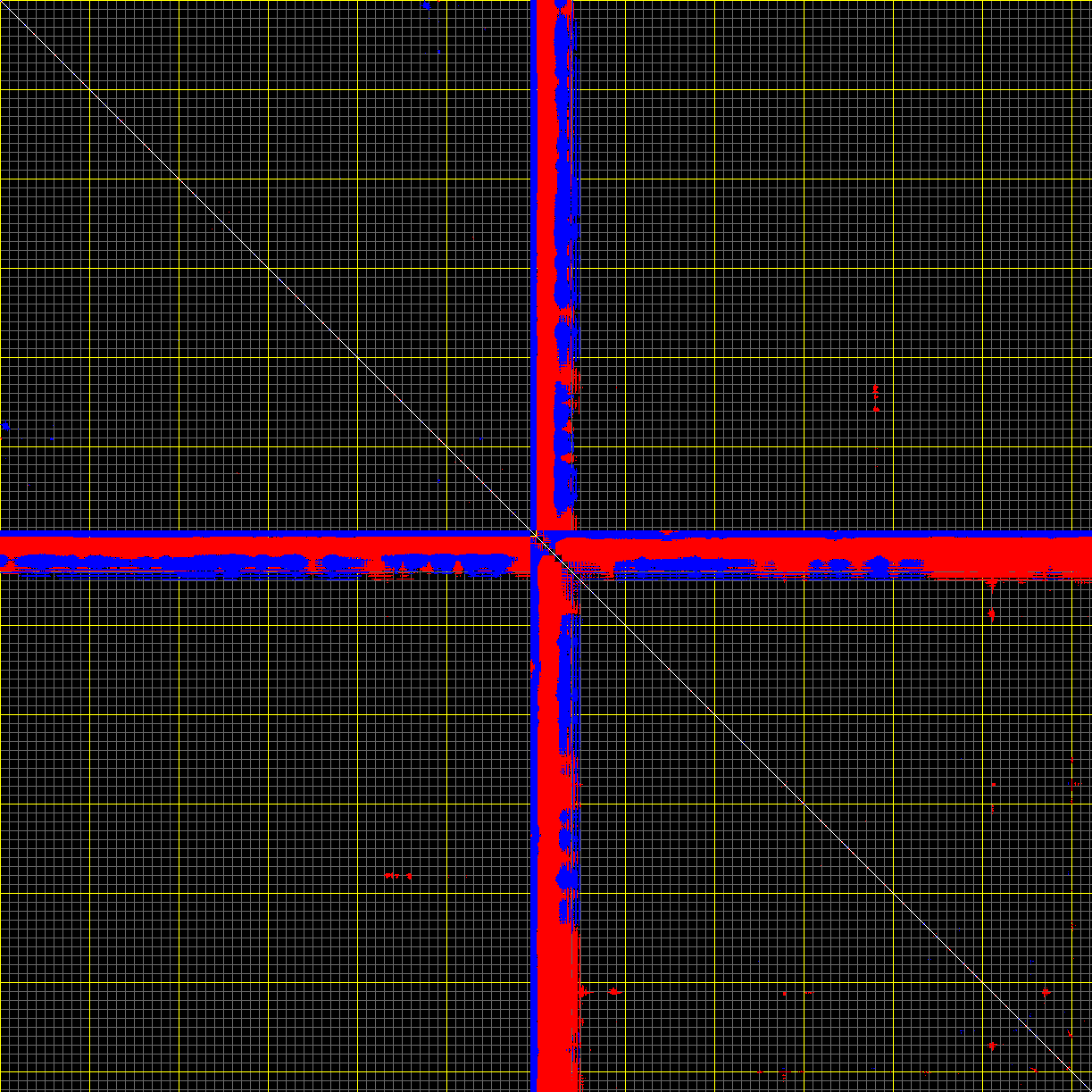 This matrix displays the maximum distance fluctuations between all pairs of CA atoms and between the two extreme conformations that were computed for this mode (DQMIN/DQMAX). Distance increases are plotted in blue and decreases in red for the strongest 10% of the residue pair distance changes. Every pixel corresponds to a single residue. Grey lines are drawn every 10 residues, yellow lines every 100 residues (counting from the upper left corner).