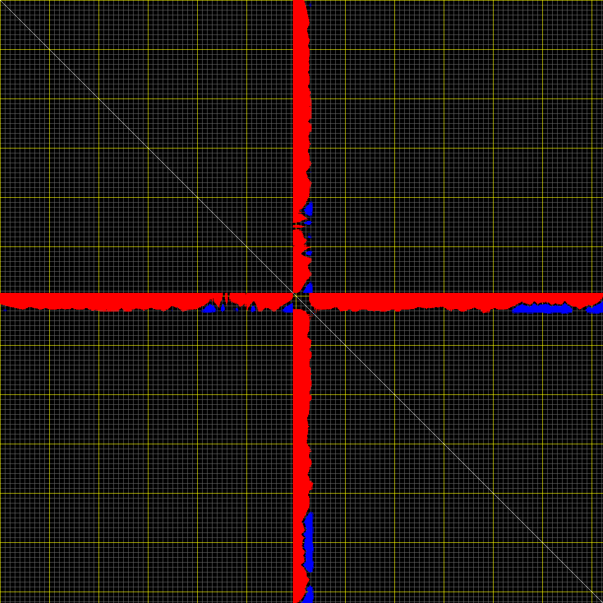 This matrix displays the maximum distance fluctuations between all pairs of CA atoms and between the two extreme conformations that were computed for this mode (DQMIN/DQMAX). Distance increases are plotted in blue and decreases in red for the strongest 10% of the residue pair distance changes. Every pixel corresponds to a single residue. Grey lines are drawn every 10 residues, yellow lines every 100 residues (counting from the upper left corner).