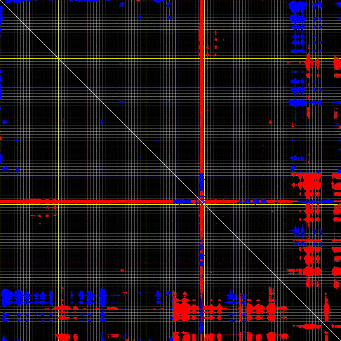 This matrix displays the maximum distance fluctuations between all pairs of CA atoms and between the two extreme conformations that were computed for this mode (DQMIN/DQMAX). Distance increases are plotted in blue and decreases in red for the strongest 10% of the residue pair distance changes. Every pixel corresponds to a single residue. Grey lines are drawn every 10 residues, yellow lines every 100 residues (counting from the upper left corner).