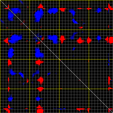 This matrix displays the maximum distance fluctuations between all pairs of CA atoms and between the two extreme conformations that were computed for this mode (DQMIN/DQMAX). Distance increases are plotted in blue and decreases in red for the strongest 10% of the residue pair distance changes. Every pixel corresponds to a single residue. Grey lines are drawn every 10 residues, yellow lines every 100 residues (counting from the upper left corner).