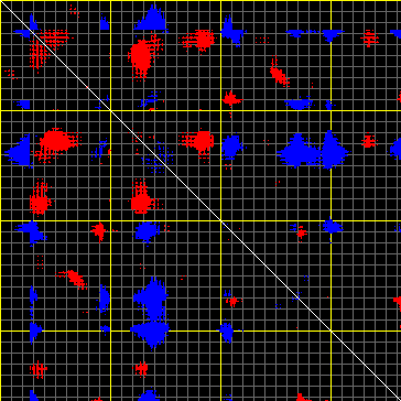 This matrix displays the maximum distance fluctuations between all pairs of CA atoms and between the two extreme conformations that were computed for this mode (DQMIN/DQMAX). Distance increases are plotted in blue and decreases in red for the strongest 10% of the residue pair distance changes. Every pixel corresponds to a single residue. Grey lines are drawn every 10 residues, yellow lines every 100 residues (counting from the upper left corner).