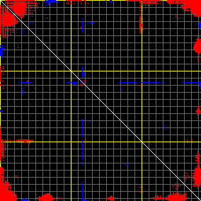 This matrix displays the maximum distance fluctuations between all pairs of CA atoms and between the two extreme conformations that were computed for this mode (DQMIN/DQMAX). Distance increases are plotted in blue and decreases in red for the strongest 10% of the residue pair distance changes. Every pixel corresponds to a single residue. Grey lines are drawn every 10 residues, yellow lines every 100 residues (counting from the upper left corner).