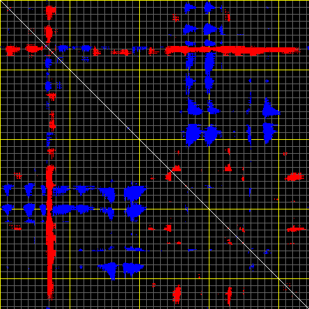 This matrix displays the maximum distance fluctuations between all pairs of CA atoms and between the two extreme conformations that were computed for this mode (DQMIN/DQMAX). Distance increases are plotted in blue and decreases in red for the strongest 10% of the residue pair distance changes. Every pixel corresponds to a single residue. Grey lines are drawn every 10 residues, yellow lines every 100 residues (counting from the upper left corner).
