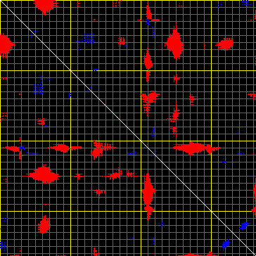 This matrix displays the maximum distance fluctuations between all pairs of CA atoms and between the two extreme conformations that were computed for this mode (DQMIN/DQMAX). Distance increases are plotted in blue and decreases in red for the strongest 10% of the residue pair distance changes. Every pixel corresponds to a single residue. Grey lines are drawn every 10 residues, yellow lines every 100 residues (counting from the upper left corner).
