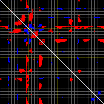 This matrix displays the maximum distance fluctuations between all pairs of CA atoms and between the two extreme conformations that were computed for this mode (DQMIN/DQMAX). Distance increases are plotted in blue and decreases in red for the strongest 10% of the residue pair distance changes. Every pixel corresponds to a single residue. Grey lines are drawn every 10 residues, yellow lines every 100 residues (counting from the upper left corner).