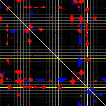 This matrix displays the maximum distance fluctuations between all pairs of CA atoms and between the two extreme conformations that were computed for this mode (DQMIN/DQMAX). Distance increases are plotted in blue and decreases in red for the strongest 10% of the residue pair distance changes. Every pixel corresponds to a single residue. Grey lines are drawn every 10 residues, yellow lines every 100 residues (counting from the upper left corner).