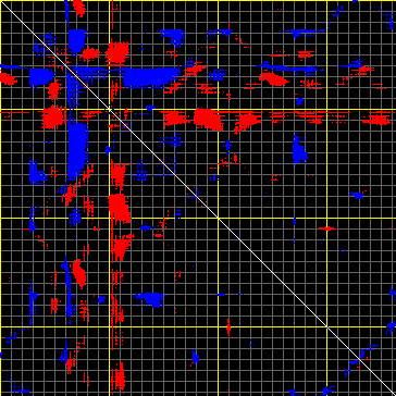 This matrix displays the maximum distance fluctuations between all pairs of CA atoms and between the two extreme conformations that were computed for this mode (DQMIN/DQMAX). Distance increases are plotted in blue and decreases in red for the strongest 10% of the residue pair distance changes. Every pixel corresponds to a single residue. Grey lines are drawn every 10 residues, yellow lines every 100 residues (counting from the upper left corner).