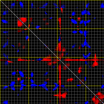 This matrix displays the maximum distance fluctuations between all pairs of CA atoms and between the two extreme conformations that were computed for this mode (DQMIN/DQMAX). Distance increases are plotted in blue and decreases in red for the strongest 10% of the residue pair distance changes. Every pixel corresponds to a single residue. Grey lines are drawn every 10 residues, yellow lines every 100 residues (counting from the upper left corner).