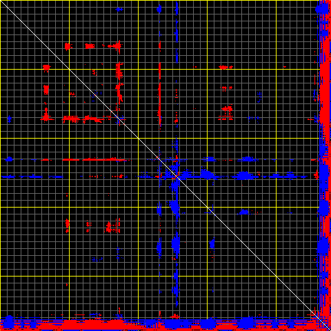 This matrix displays the maximum distance fluctuations between all pairs of CA atoms and between the two extreme conformations that were computed for this mode (DQMIN/DQMAX). Distance increases are plotted in blue and decreases in red for the strongest 10% of the residue pair distance changes. Every pixel corresponds to a single residue. Grey lines are drawn every 10 residues, yellow lines every 100 residues (counting from the upper left corner).