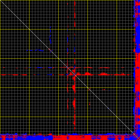 This matrix displays the maximum distance fluctuations between all pairs of CA atoms and between the two extreme conformations that were computed for this mode (DQMIN/DQMAX). Distance increases are plotted in blue and decreases in red for the strongest 10% of the residue pair distance changes. Every pixel corresponds to a single residue. Grey lines are drawn every 10 residues, yellow lines every 100 residues (counting from the upper left corner).