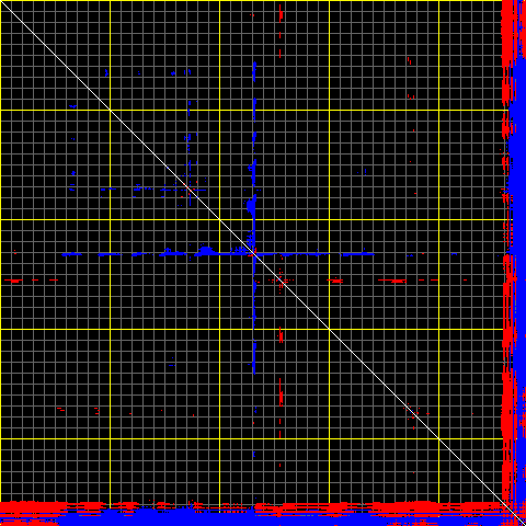 This matrix displays the maximum distance fluctuations between all pairs of CA atoms and between the two extreme conformations that were computed for this mode (DQMIN/DQMAX). Distance increases are plotted in blue and decreases in red for the strongest 10% of the residue pair distance changes. Every pixel corresponds to a single residue. Grey lines are drawn every 10 residues, yellow lines every 100 residues (counting from the upper left corner).