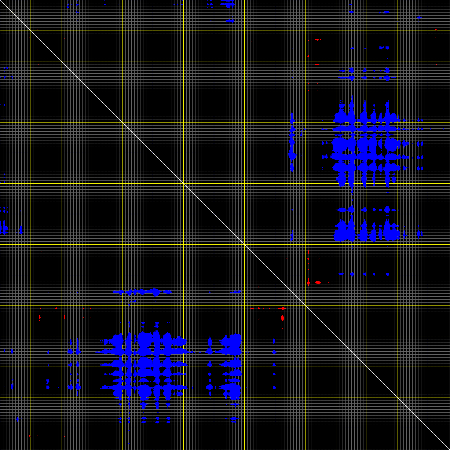 This matrix displays the maximum distance fluctuations between all pairs of CA atoms and between the two extreme conformations that were computed for this mode (DQMIN/DQMAX). Distance increases are plotted in blue and decreases in red for the strongest 10% of the residue pair distance changes. Every pixel corresponds to a single residue. Grey lines are drawn every 10 residues, yellow lines every 100 residues (counting from the upper left corner).