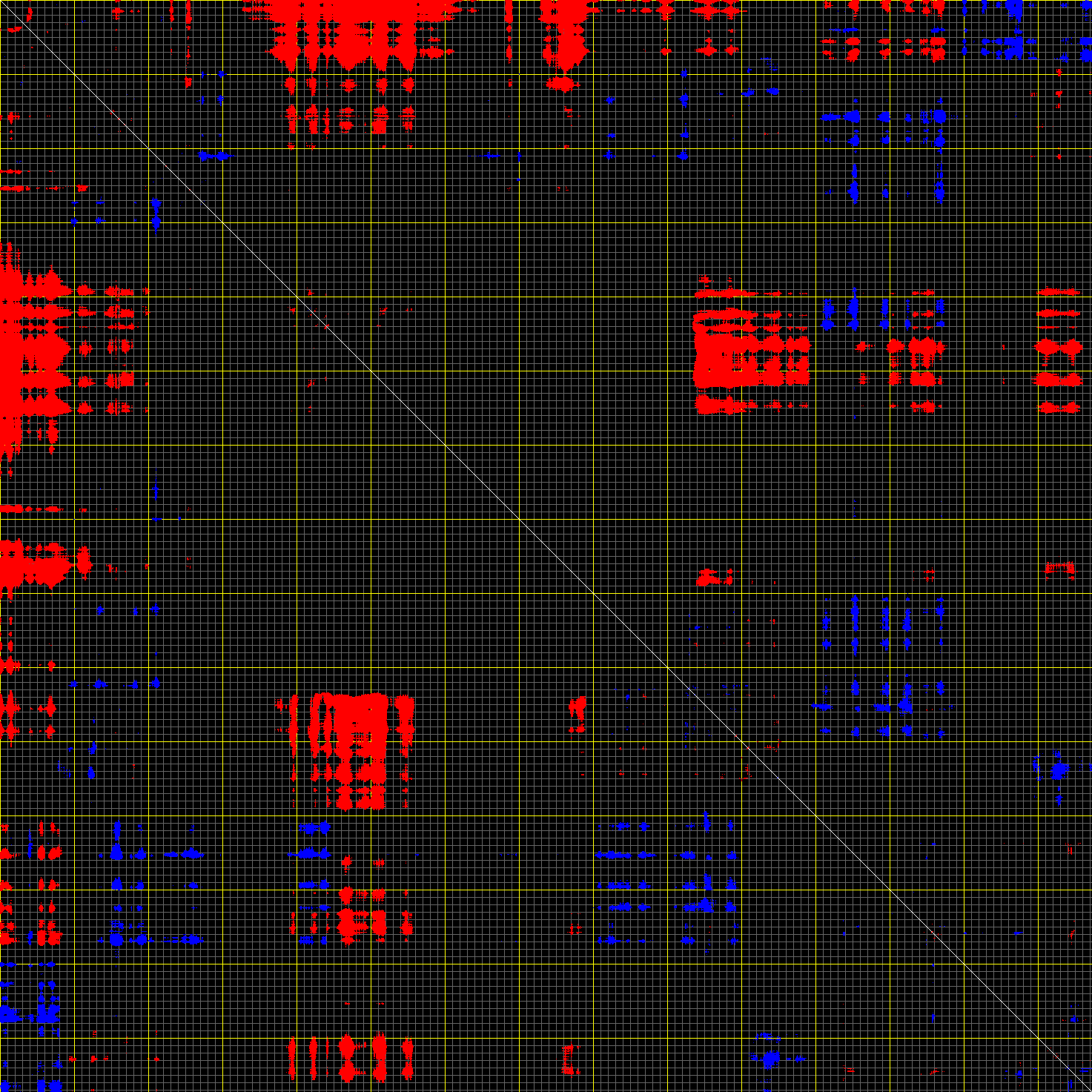 This matrix displays the maximum distance fluctuations between all pairs of CA atoms and between the two extreme conformations that were computed for this mode (DQMIN/DQMAX). Distance increases are plotted in blue and decreases in red for the strongest 10% of the residue pair distance changes. Every pixel corresponds to a single residue. Grey lines are drawn every 10 residues, yellow lines every 100 residues (counting from the upper left corner).