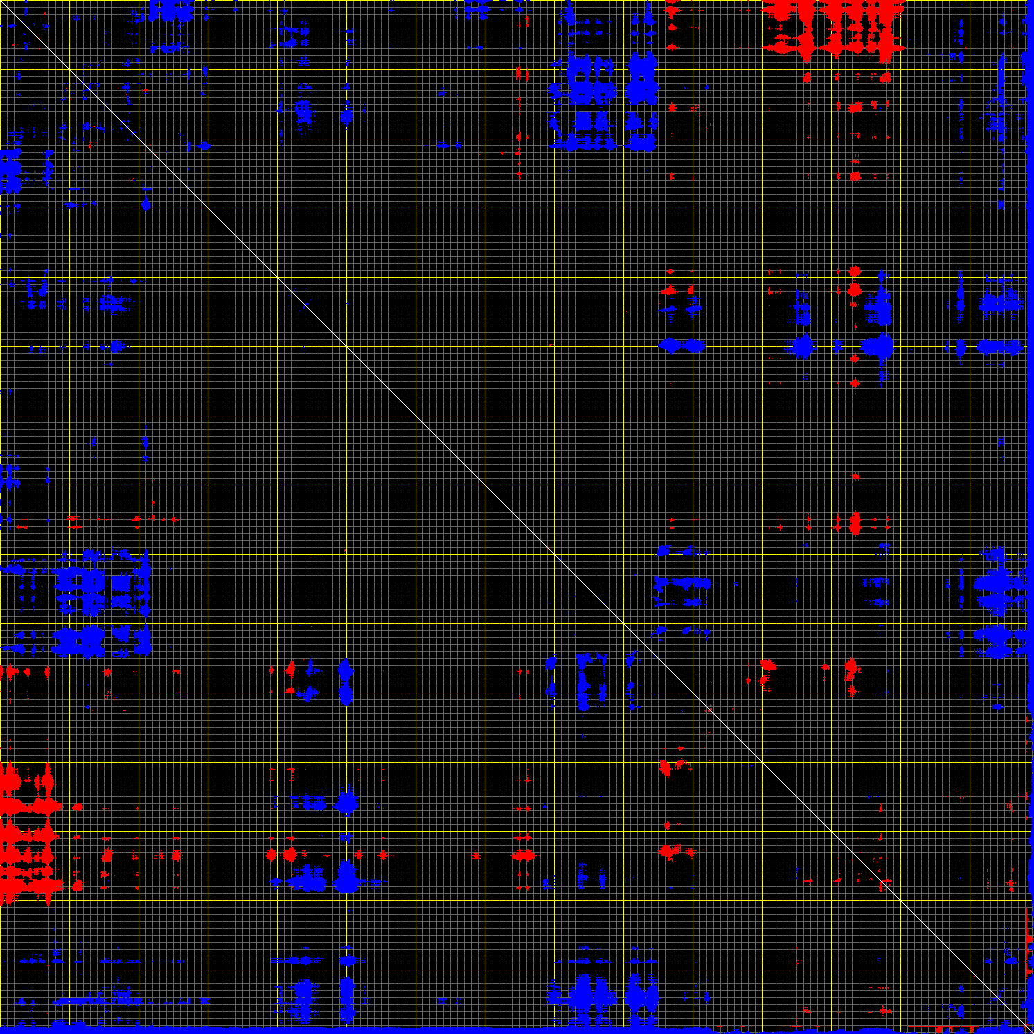 This matrix displays the maximum distance fluctuations between all pairs of CA atoms and between the two extreme conformations that were computed for this mode (DQMIN/DQMAX). Distance increases are plotted in blue and decreases in red for the strongest 10% of the residue pair distance changes. Every pixel corresponds to a single residue. Grey lines are drawn every 10 residues, yellow lines every 100 residues (counting from the upper left corner).