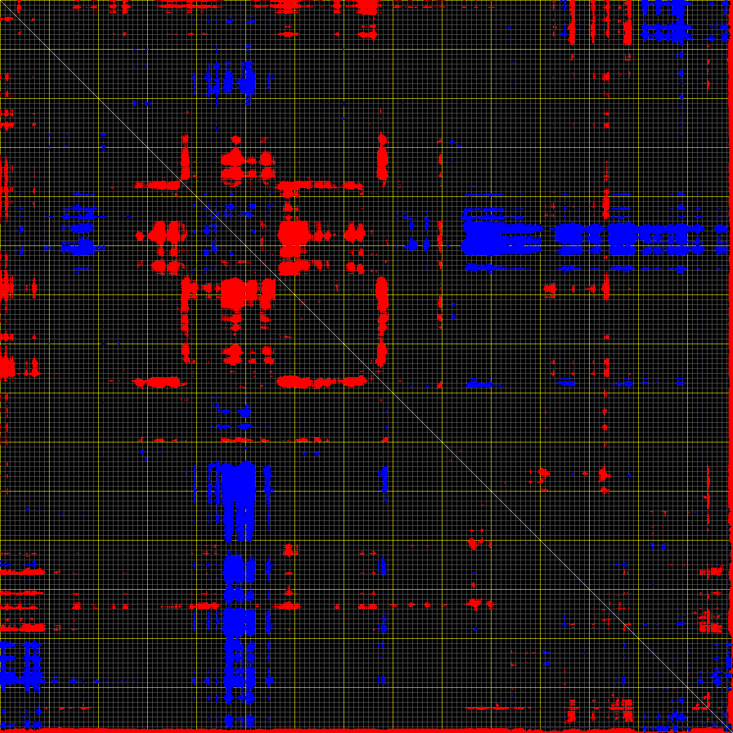 This matrix displays the maximum distance fluctuations between all pairs of CA atoms and between the two extreme conformations that were computed for this mode (DQMIN/DQMAX). Distance increases are plotted in blue and decreases in red for the strongest 10% of the residue pair distance changes. Every pixel corresponds to a single residue. Grey lines are drawn every 10 residues, yellow lines every 100 residues (counting from the upper left corner).