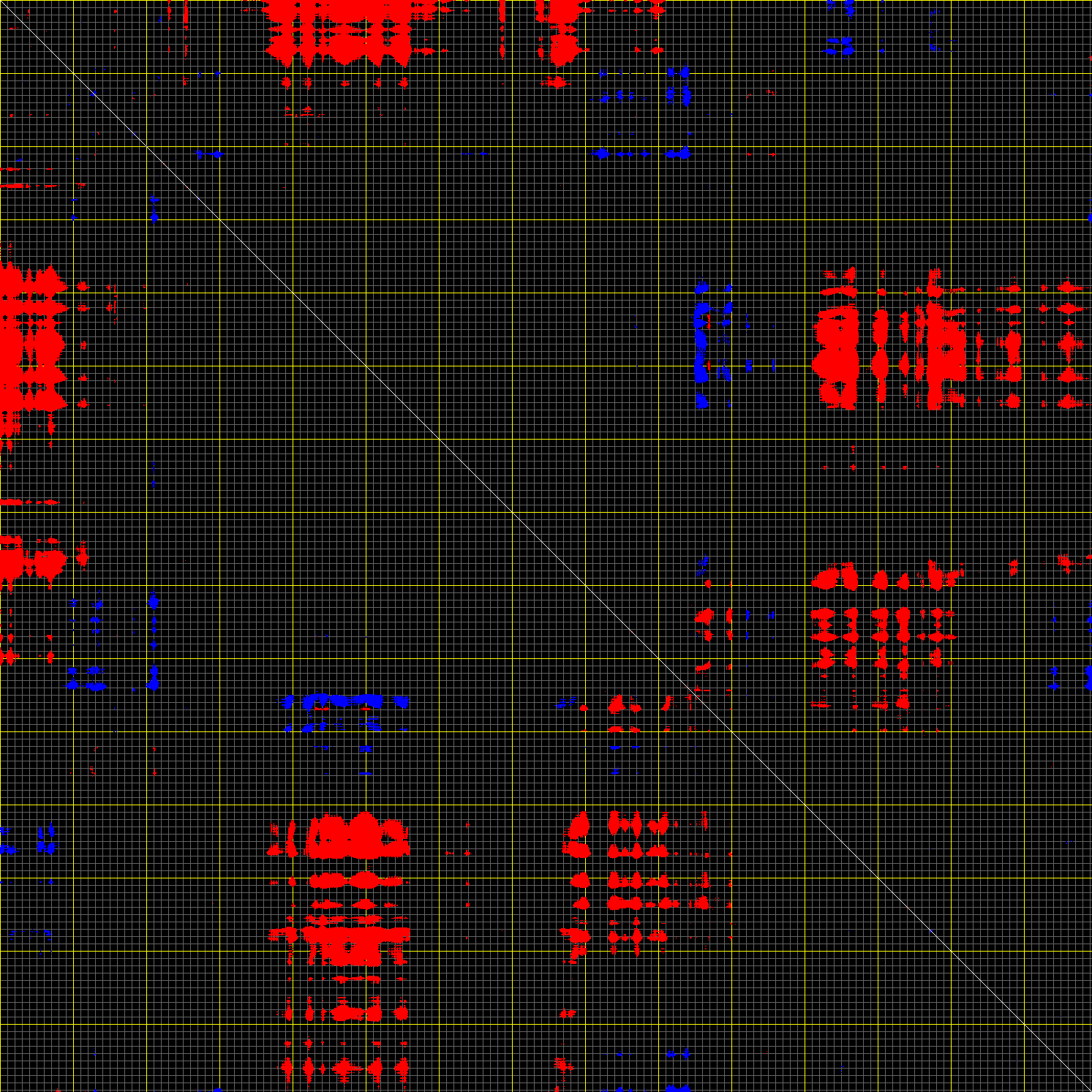 This matrix displays the maximum distance fluctuations between all pairs of CA atoms and between the two extreme conformations that were computed for this mode (DQMIN/DQMAX). Distance increases are plotted in blue and decreases in red for the strongest 10% of the residue pair distance changes. Every pixel corresponds to a single residue. Grey lines are drawn every 10 residues, yellow lines every 100 residues (counting from the upper left corner).
