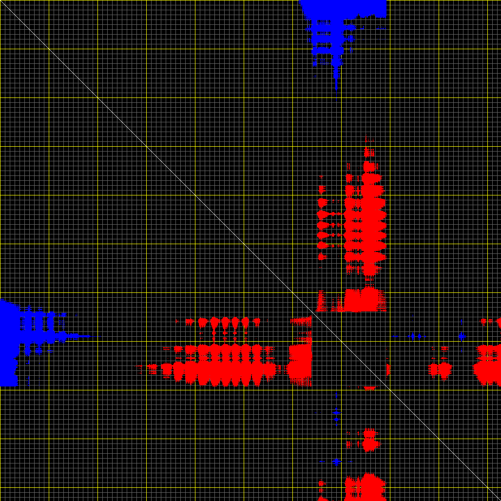 This matrix displays the maximum distance fluctuations between all pairs of CA atoms and between the two extreme conformations that were computed for this mode (DQMIN/DQMAX). Distance increases are plotted in blue and decreases in red for the strongest 10% of the residue pair distance changes. Every pixel corresponds to a single residue. Grey lines are drawn every 10 residues, yellow lines every 100 residues (counting from the upper left corner).