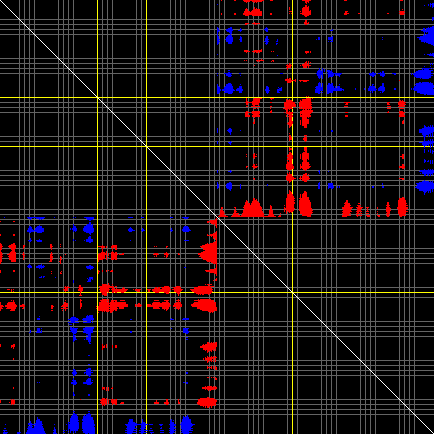 This matrix displays the maximum distance fluctuations between all pairs of CA atoms and between the two extreme conformations that were computed for this mode (DQMIN/DQMAX). Distance increases are plotted in blue and decreases in red for the strongest 10% of the residue pair distance changes. Every pixel corresponds to a single residue. Grey lines are drawn every 10 residues, yellow lines every 100 residues (counting from the upper left corner).
