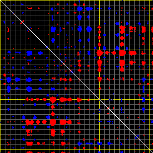 This matrix displays the maximum distance fluctuations between all pairs of CA atoms and between the two extreme conformations that were computed for this mode (DQMIN/DQMAX). Distance increases are plotted in blue and decreases in red for the strongest 10% of the residue pair distance changes. Every pixel corresponds to a single residue. Grey lines are drawn every 10 residues, yellow lines every 100 residues (counting from the upper left corner).