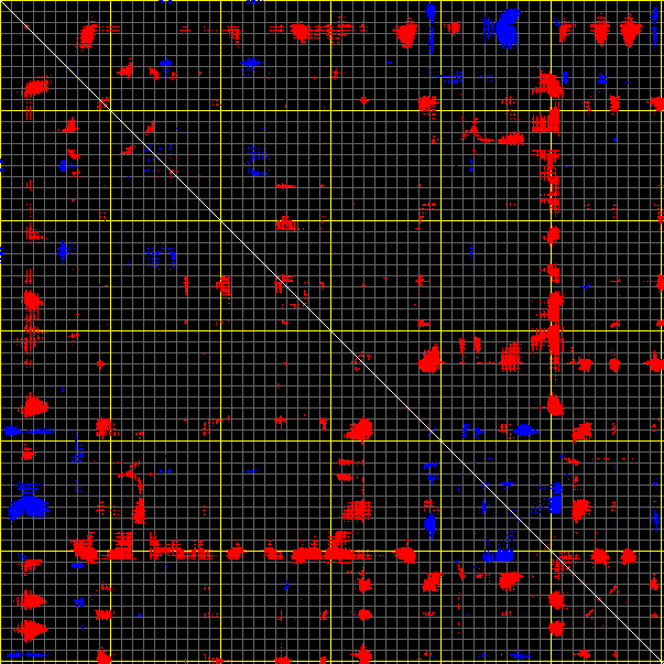 This matrix displays the maximum distance fluctuations between all pairs of CA atoms and between the two extreme conformations that were computed for this mode (DQMIN/DQMAX). Distance increases are plotted in blue and decreases in red for the strongest 10% of the residue pair distance changes. Every pixel corresponds to a single residue. Grey lines are drawn every 10 residues, yellow lines every 100 residues (counting from the upper left corner).