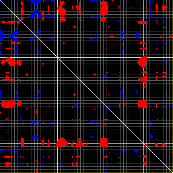 This matrix displays the maximum distance fluctuations between all pairs of CA atoms and between the two extreme conformations that were computed for this mode (DQMIN/DQMAX). Distance increases are plotted in blue and decreases in red for the strongest 10% of the residue pair distance changes. Every pixel corresponds to a single residue. Grey lines are drawn every 10 residues, yellow lines every 100 residues (counting from the upper left corner).