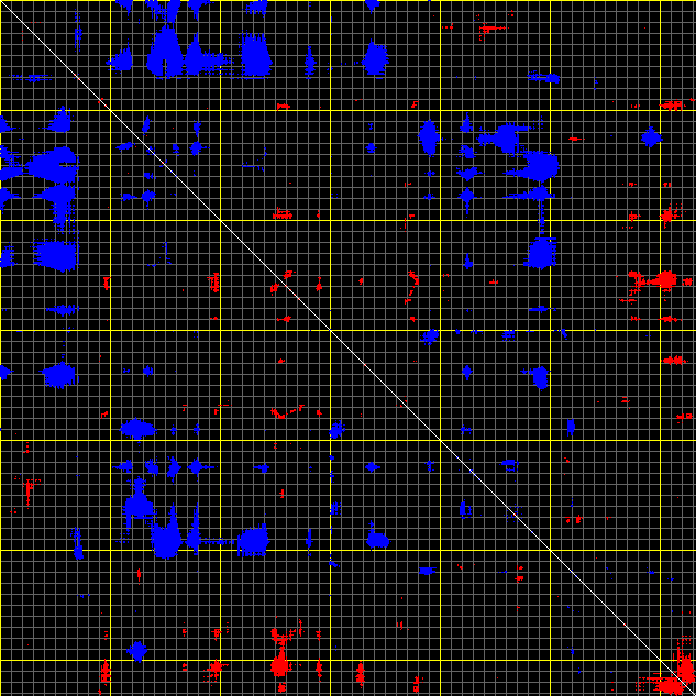 This matrix displays the maximum distance fluctuations between all pairs of CA atoms and between the two extreme conformations that were computed for this mode (DQMIN/DQMAX). Distance increases are plotted in blue and decreases in red for the strongest 10% of the residue pair distance changes. Every pixel corresponds to a single residue. Grey lines are drawn every 10 residues, yellow lines every 100 residues (counting from the upper left corner).
