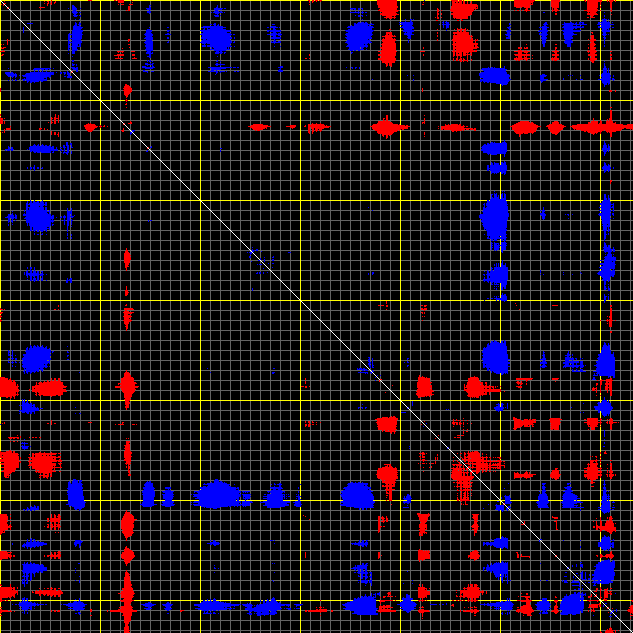 This matrix displays the maximum distance fluctuations between all pairs of CA atoms and between the two extreme conformations that were computed for this mode (DQMIN/DQMAX). Distance increases are plotted in blue and decreases in red for the strongest 10% of the residue pair distance changes. Every pixel corresponds to a single residue. Grey lines are drawn every 10 residues, yellow lines every 100 residues (counting from the upper left corner).