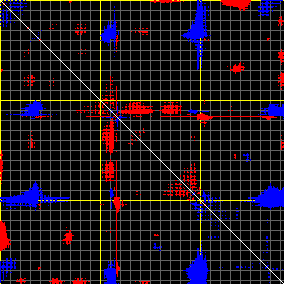 This matrix displays the maximum distance fluctuations between all pairs of CA atoms and between the two extreme conformations that were computed for this mode (DQMIN/DQMAX). Distance increases are plotted in blue and decreases in red for the strongest 10% of the residue pair distance changes. Every pixel corresponds to a single residue. Grey lines are drawn every 10 residues, yellow lines every 100 residues (counting from the upper left corner).