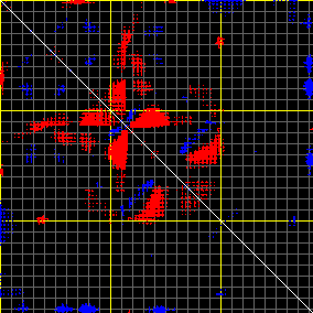 This matrix displays the maximum distance fluctuations between all pairs of CA atoms and between the two extreme conformations that were computed for this mode (DQMIN/DQMAX). Distance increases are plotted in blue and decreases in red for the strongest 10% of the residue pair distance changes. Every pixel corresponds to a single residue. Grey lines are drawn every 10 residues, yellow lines every 100 residues (counting from the upper left corner).