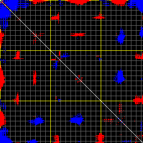 This matrix displays the maximum distance fluctuations between all pairs of CA atoms and between the two extreme conformations that were computed for this mode (DQMIN/DQMAX). Distance increases are plotted in blue and decreases in red for the strongest 10% of the residue pair distance changes. Every pixel corresponds to a single residue. Grey lines are drawn every 10 residues, yellow lines every 100 residues (counting from the upper left corner).