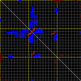 This matrix displays the maximum distance fluctuations between all pairs of CA atoms and between the two extreme conformations that were computed for this mode (DQMIN/DQMAX). Distance increases are plotted in blue and decreases in red for the strongest 10% of the residue pair distance changes. Every pixel corresponds to a single residue. Grey lines are drawn every 10 residues, yellow lines every 100 residues (counting from the upper left corner).