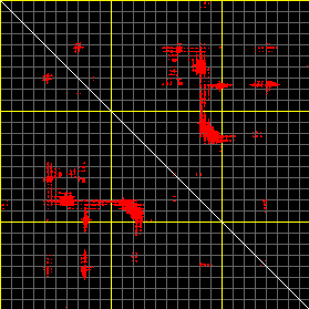 This matrix displays the maximum distance fluctuations between all pairs of CA atoms and between the two extreme conformations that were computed for this mode (DQMIN/DQMAX). Distance increases are plotted in blue and decreases in red for the strongest 10% of the residue pair distance changes. Every pixel corresponds to a single residue. Grey lines are drawn every 10 residues, yellow lines every 100 residues (counting from the upper left corner).