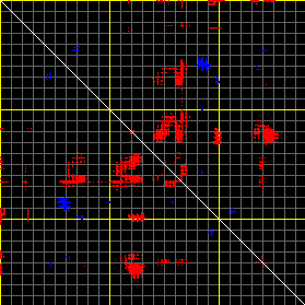 This matrix displays the maximum distance fluctuations between all pairs of CA atoms and between the two extreme conformations that were computed for this mode (DQMIN/DQMAX). Distance increases are plotted in blue and decreases in red for the strongest 10% of the residue pair distance changes. Every pixel corresponds to a single residue. Grey lines are drawn every 10 residues, yellow lines every 100 residues (counting from the upper left corner).