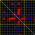 This matrix displays the maximum distance fluctuations between all pairs of CA atoms and between the two extreme conformations that were computed for this mode (DQMIN/DQMAX). Distance increases are plotted in blue and decreases in red for the strongest 10% of the residue pair distance changes. Every pixel corresponds to a single residue. Grey lines are drawn every 10 residues, yellow lines every 100 residues (counting from the upper left corner).