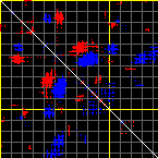 This matrix displays the maximum distance fluctuations between all pairs of CA atoms and between the two extreme conformations that were computed for this mode (DQMIN/DQMAX). Distance increases are plotted in blue and decreases in red for the strongest 10% of the residue pair distance changes. Every pixel corresponds to a single residue. Grey lines are drawn every 10 residues, yellow lines every 100 residues (counting from the upper left corner).
