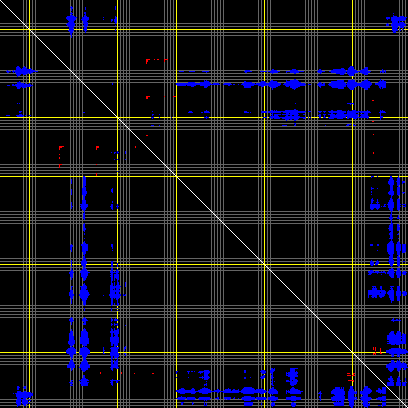 This matrix displays the maximum distance fluctuations between all pairs of CA atoms and between the two extreme conformations that were computed for this mode (DQMIN/DQMAX). Distance increases are plotted in blue and decreases in red for the strongest 10% of the residue pair distance changes. Every pixel corresponds to a single residue. Grey lines are drawn every 10 residues, yellow lines every 100 residues (counting from the upper left corner).