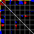 This matrix displays the maximum distance fluctuations between all pairs of CA atoms and between the two extreme conformations that were computed for this mode (DQMIN/DQMAX). Distance increases are plotted in blue and decreases in red for the strongest 10% of the residue pair distance changes. Every pixel corresponds to a single residue. Grey lines are drawn every 10 residues, yellow lines every 100 residues (counting from the upper left corner).