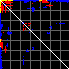 This matrix displays the maximum distance fluctuations between all pairs of CA atoms and between the two extreme conformations that were computed for this mode (DQMIN/DQMAX). Distance increases are plotted in blue and decreases in red for the strongest 10% of the residue pair distance changes. Every pixel corresponds to a single residue. Grey lines are drawn every 10 residues, yellow lines every 100 residues (counting from the upper left corner).
