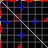 This matrix displays the maximum distance fluctuations between all pairs of CA atoms and between the two extreme conformations that were computed for this mode (DQMIN/DQMAX). Distance increases are plotted in blue and decreases in red for the strongest 10% of the residue pair distance changes. Every pixel corresponds to a single residue. Grey lines are drawn every 10 residues, yellow lines every 100 residues (counting from the upper left corner).