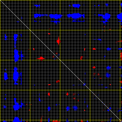 This matrix displays the maximum distance fluctuations between all pairs of CA atoms and between the two extreme conformations that were computed for this mode (DQMIN/DQMAX). Distance increases are plotted in blue and decreases in red for the strongest 10% of the residue pair distance changes. Every pixel corresponds to a single residue. Grey lines are drawn every 10 residues, yellow lines every 100 residues (counting from the upper left corner).