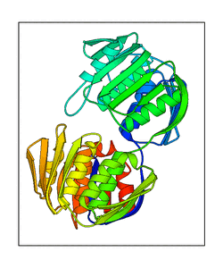 These views are prepared from three orthologuous viewpoints with MolScript. Secondary structures are determined from the C-alpha atom positions of your protein (N-terminal blue, C-terminal red).