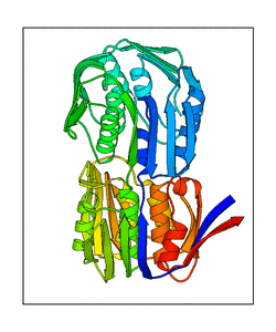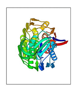 These views are prepared from three orthologuous viewpoints with MolScript. Secondary structures are determined from the C-alpha atom positions of your protein (N-terminal blue, C-terminal red).